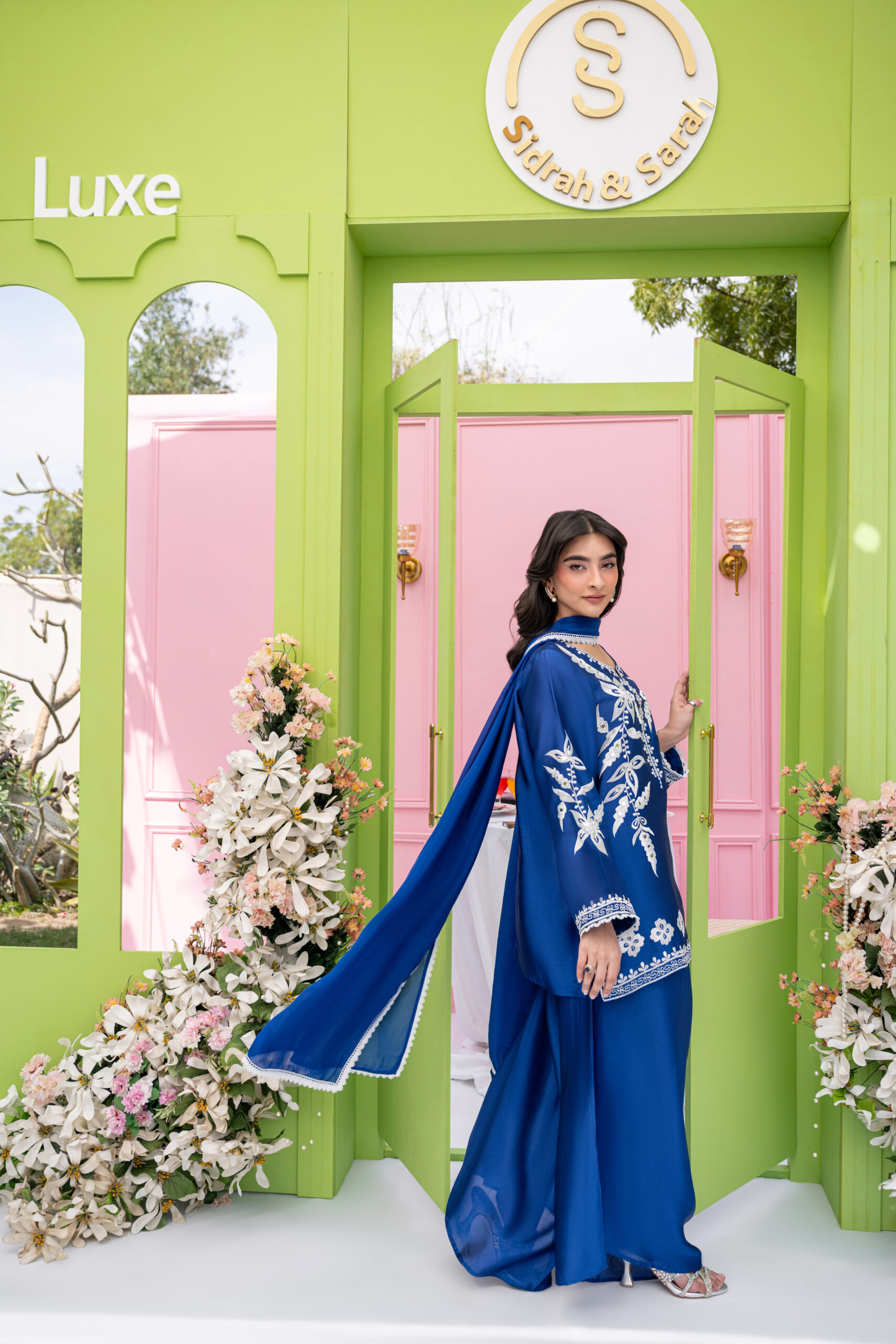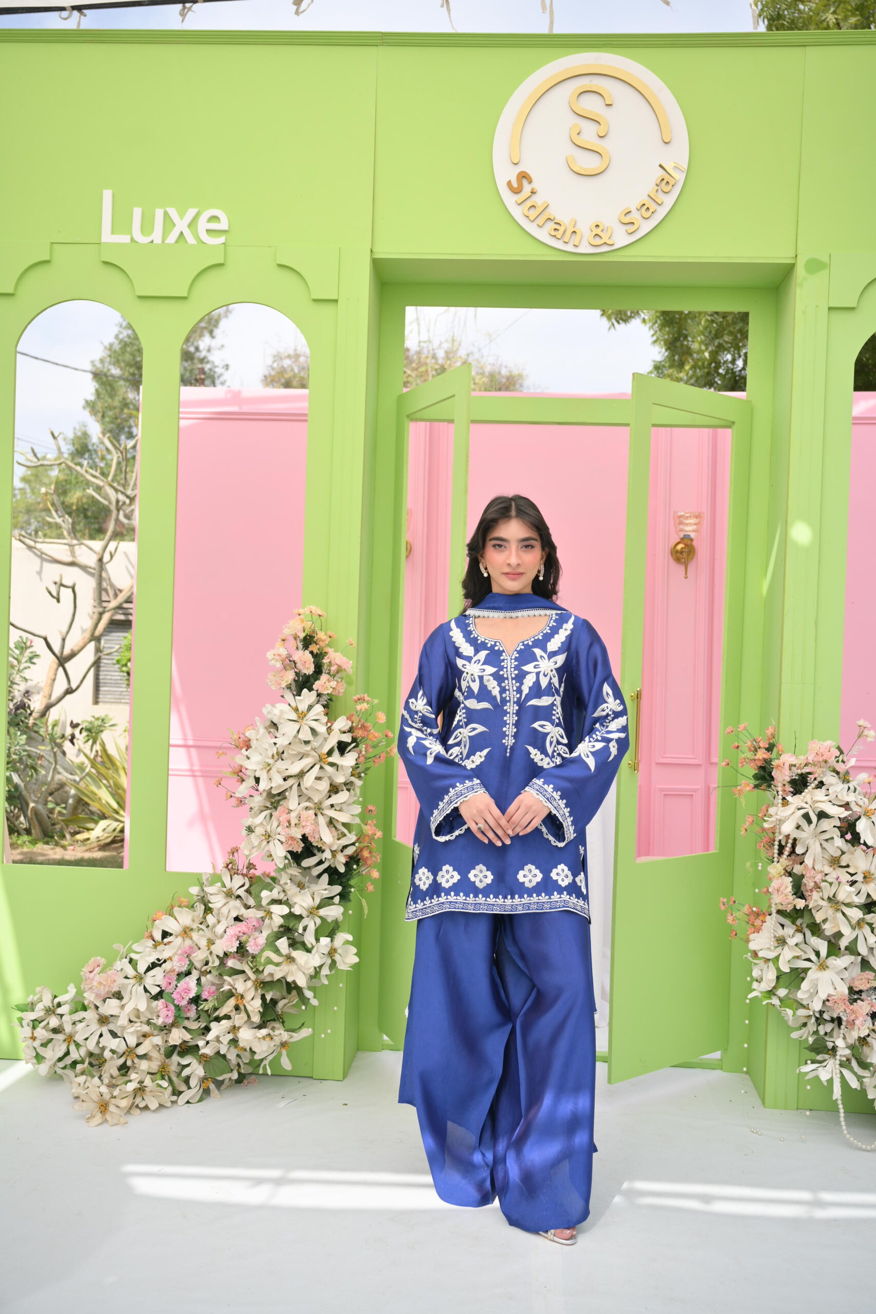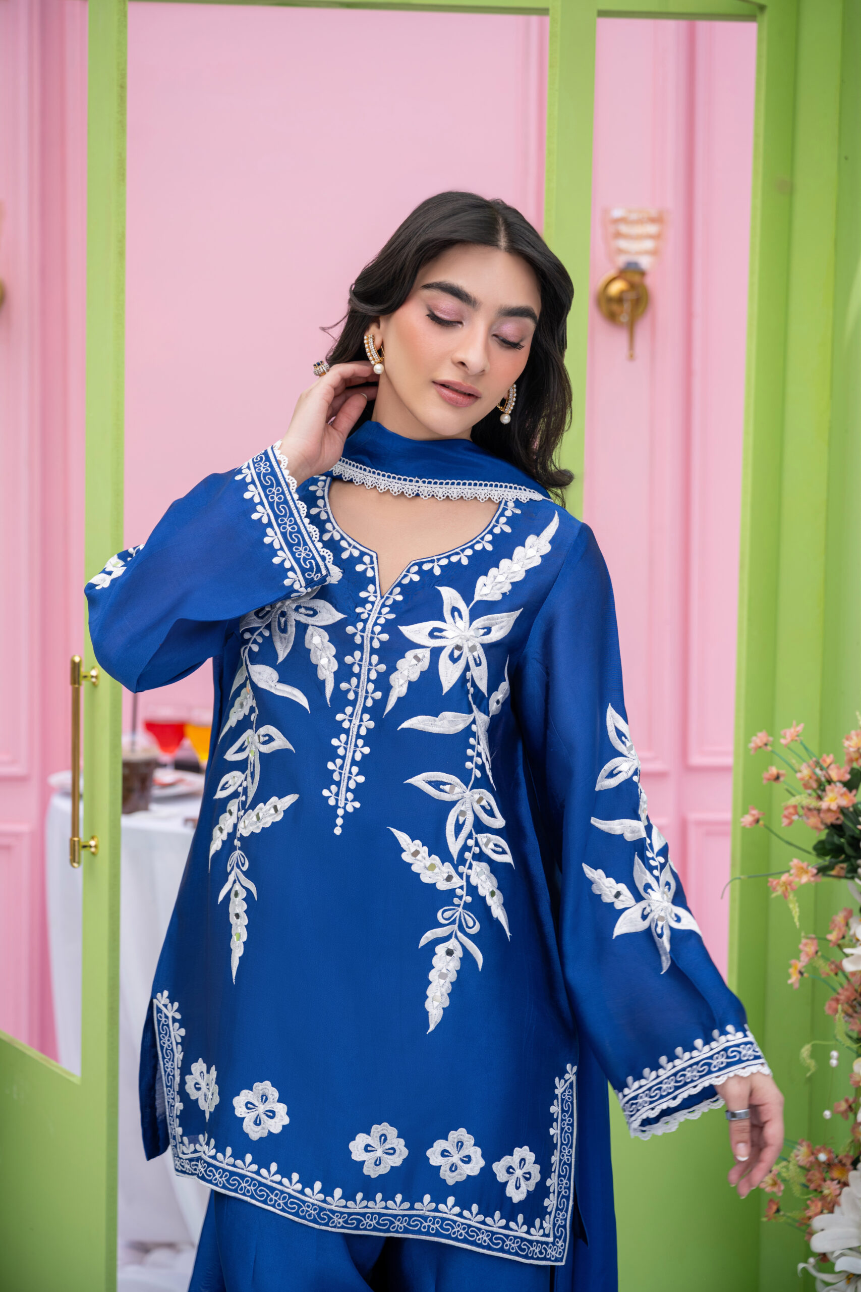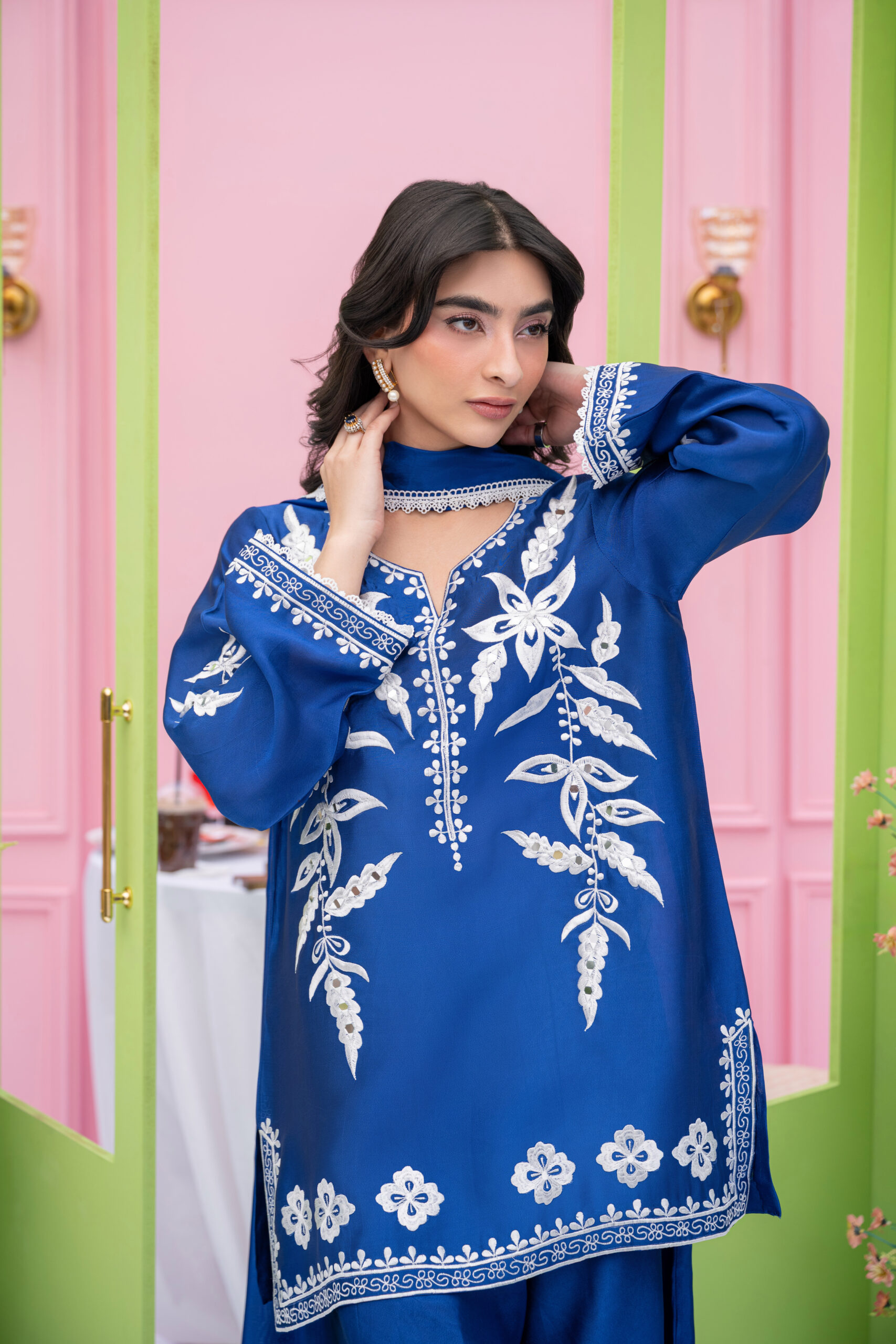 A refined sheesha silk outfit in soft blue and ivory tones, adorned with machine embroidery and big mirror details, complemented by a farshi shalwar and lace-edged dupatta.