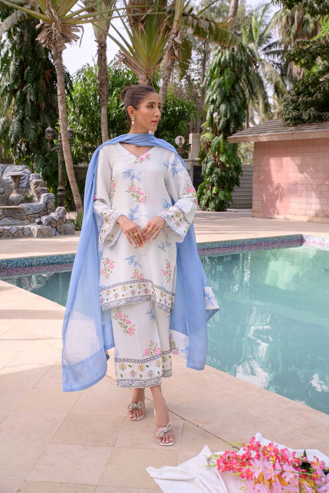 Dupatta: Crafted from pure silk, ?with beautiful bow print?borders.