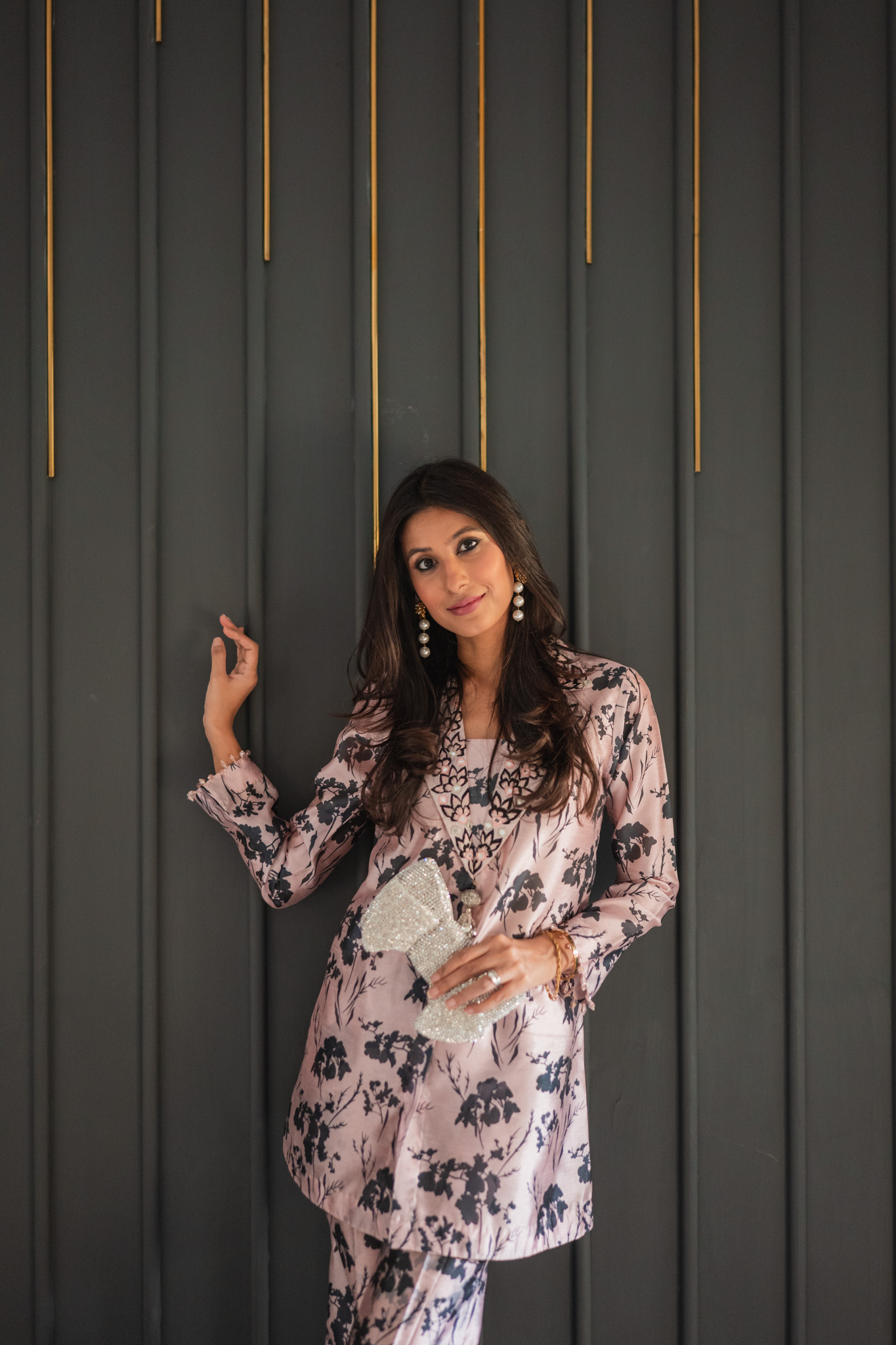 1. A Perfect Symhony of? bright colours and print merged together on this power silhouette. The delicate Embroidery & Embellishment on the collars defines playful minimalism. The look is paired with same print bootcut pants for effortless evening Chic.