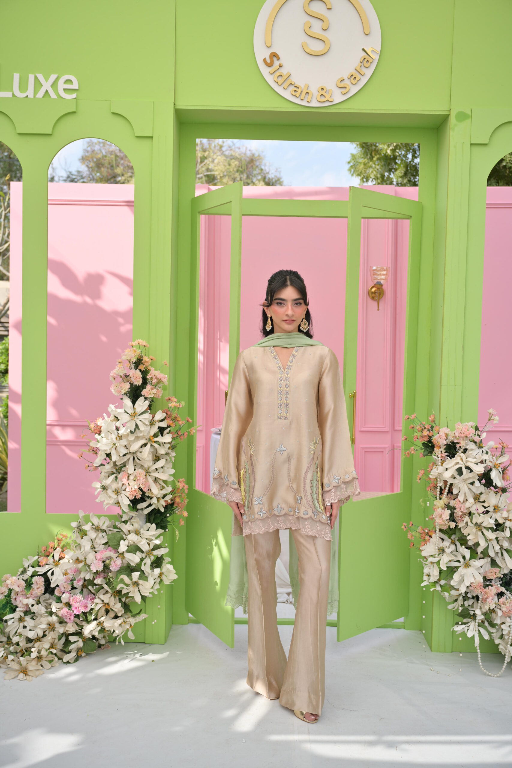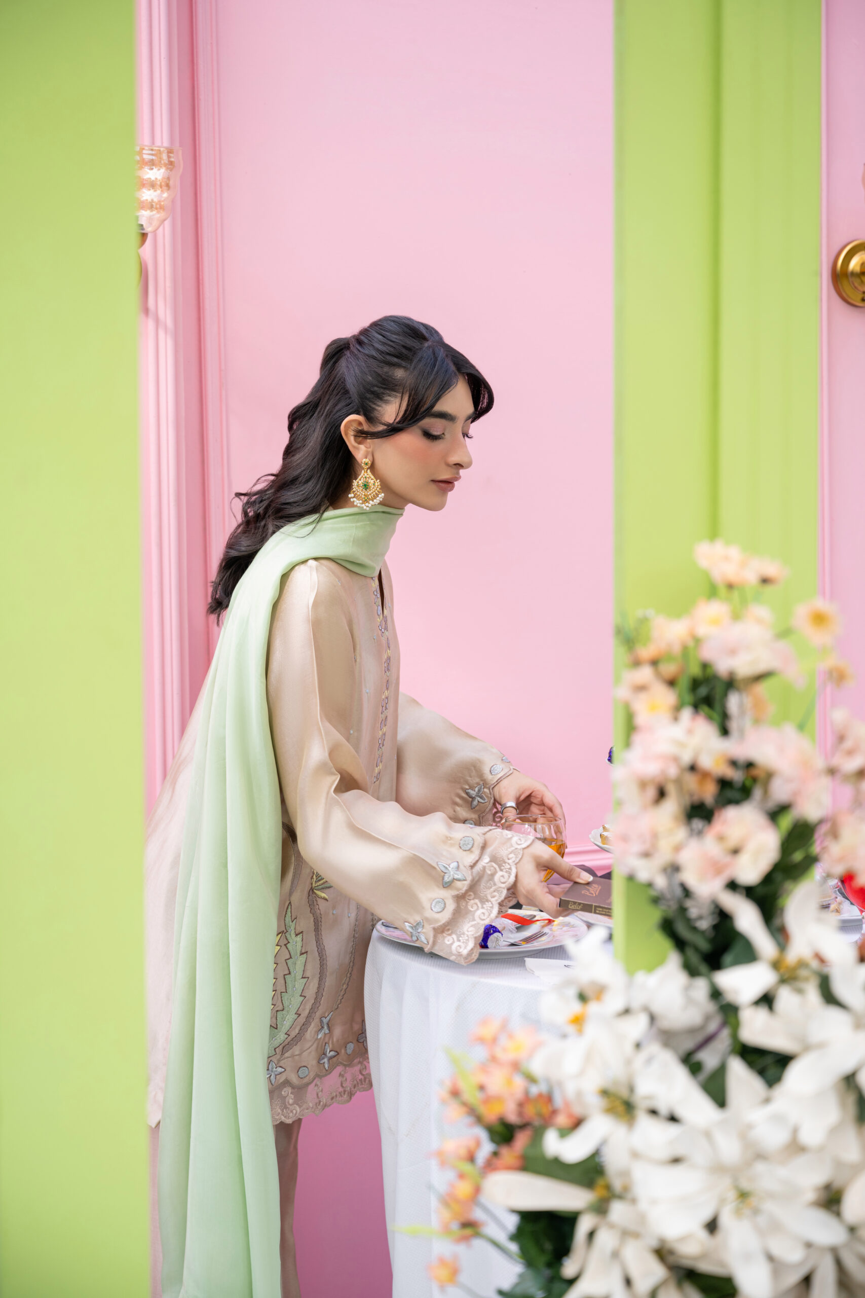 Elegant in beige. A hand-embroidered shirt paired with a rich green sheesha silk dupatta, blending tradition with subtle luxury. Perfect for making a graceful statement at any occasion.