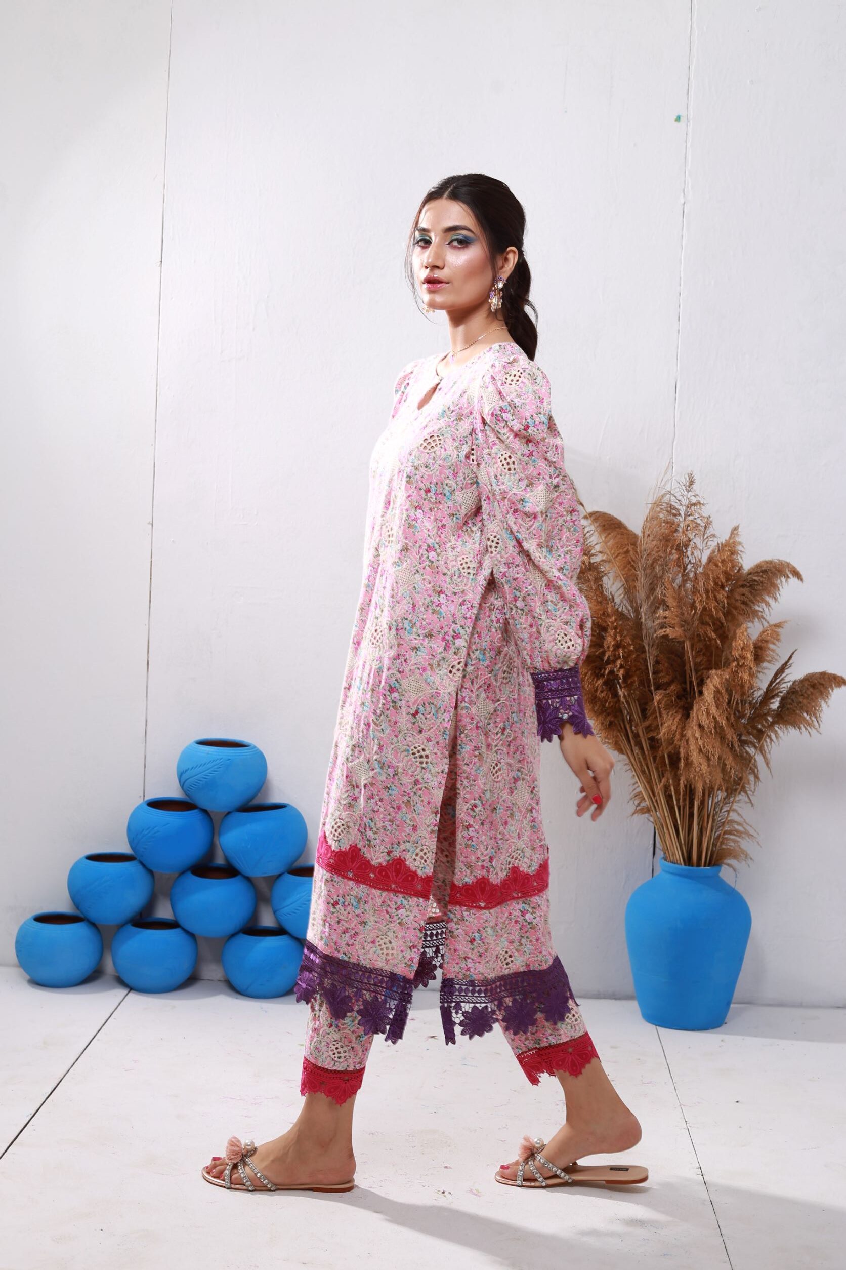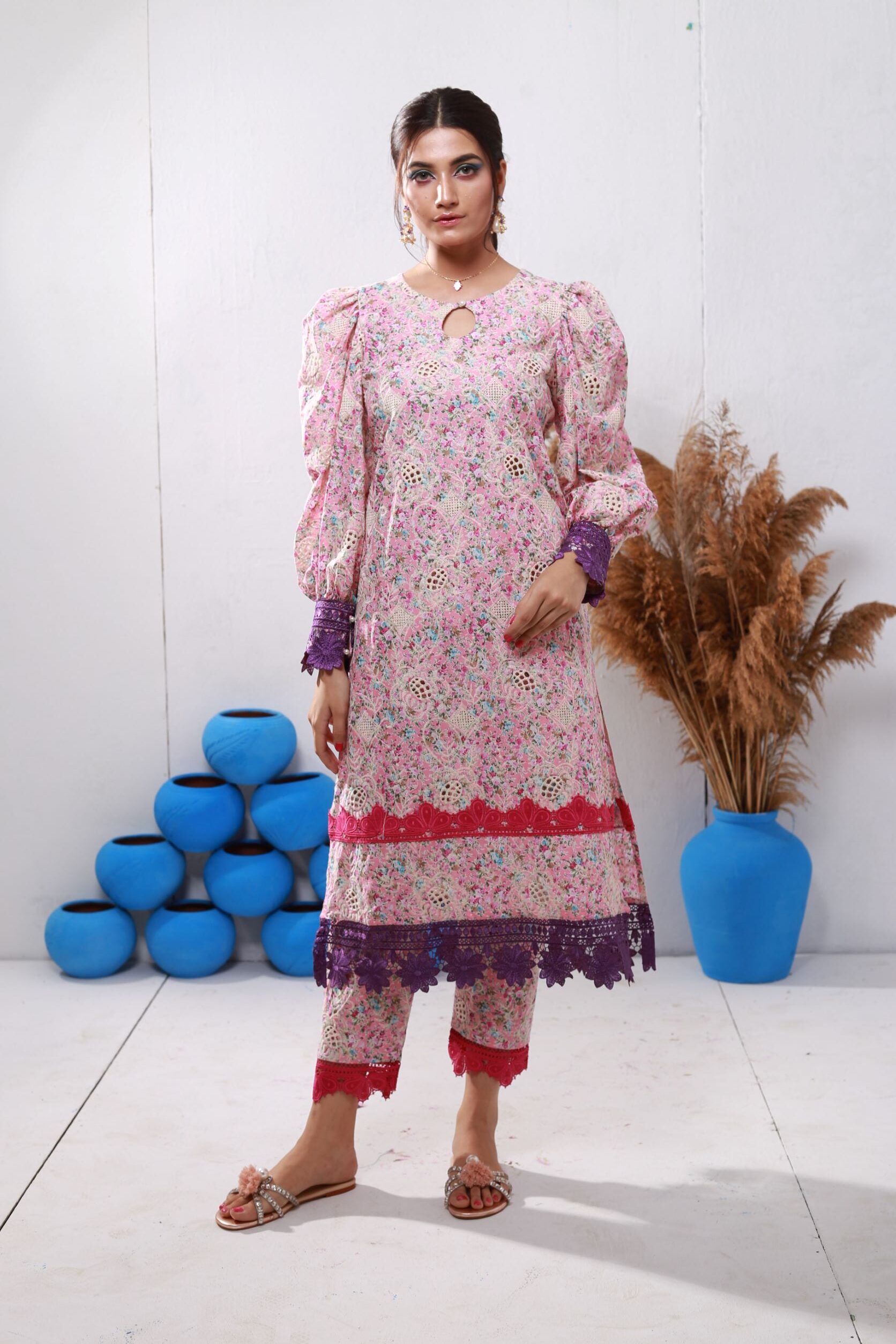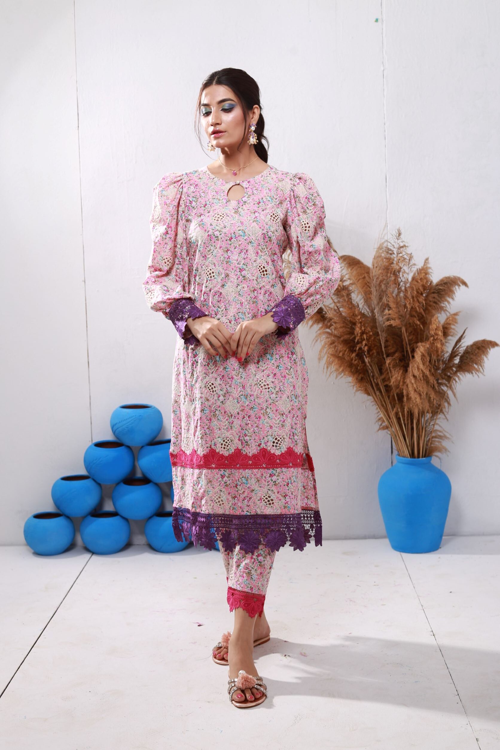 Put a classic spin with this easy breezy pastels set. Dotted with white worked on this chai pink outfit to give it a classic look and embellished with laces & Puffy sleeves Timeless addition to your wardrobe.