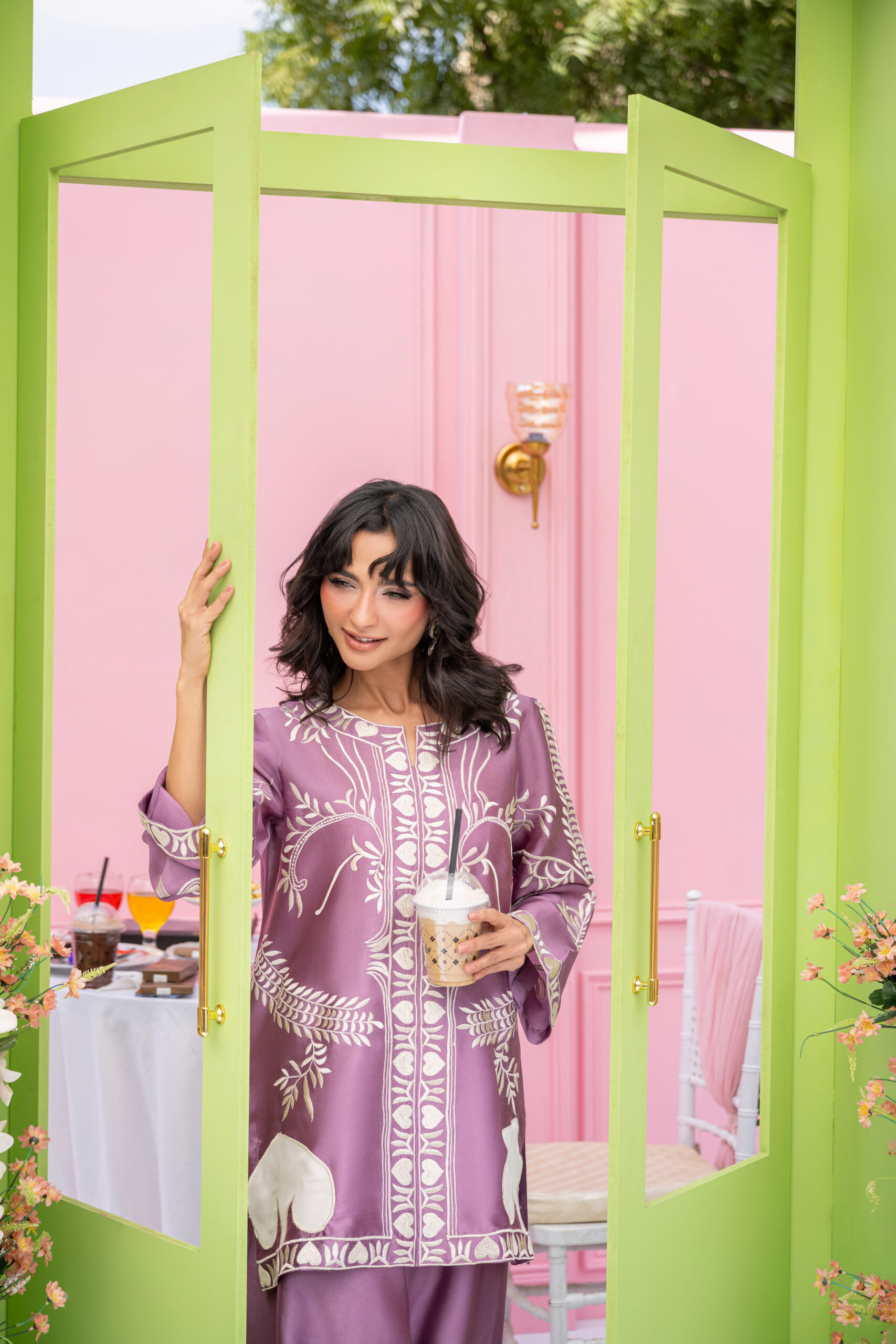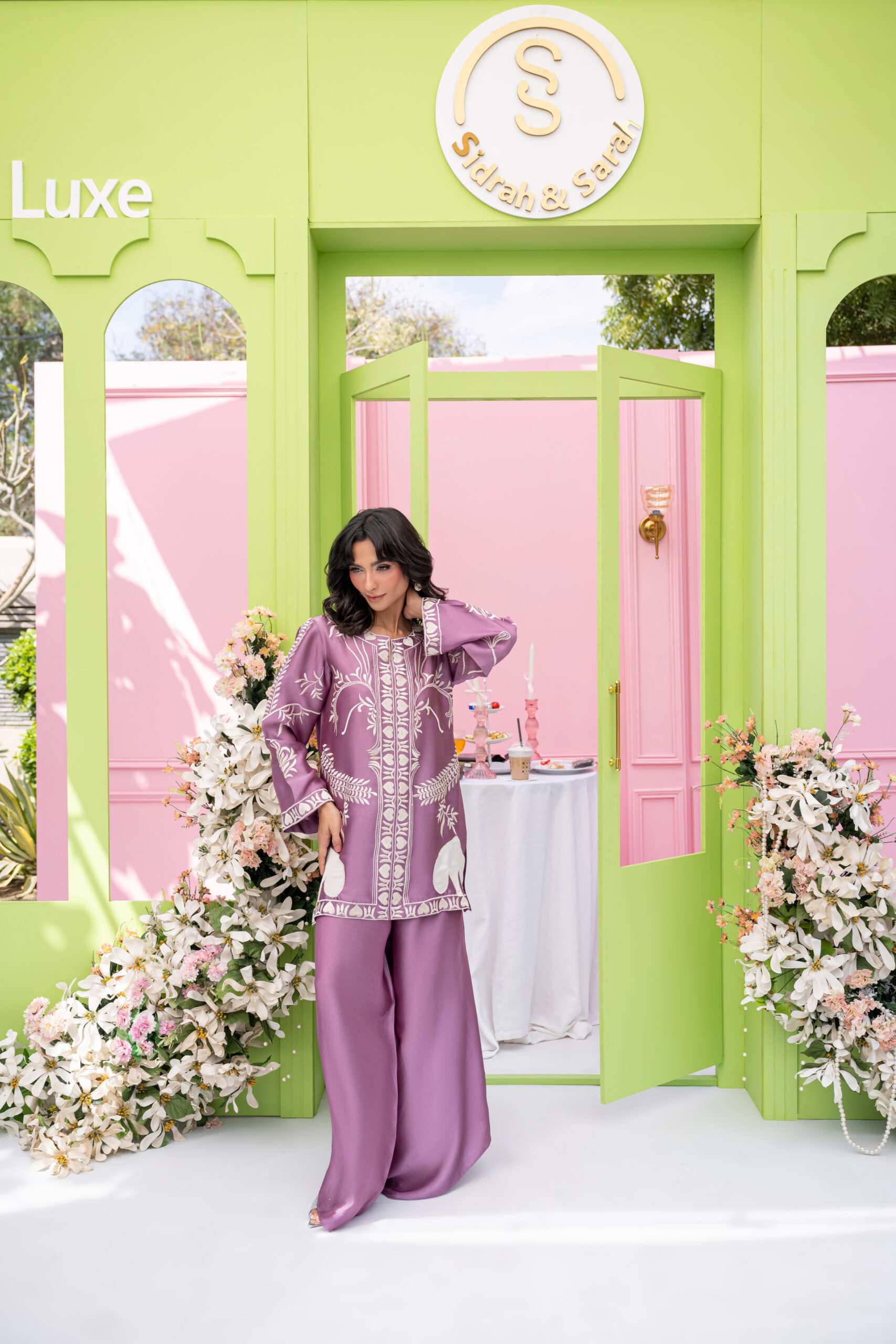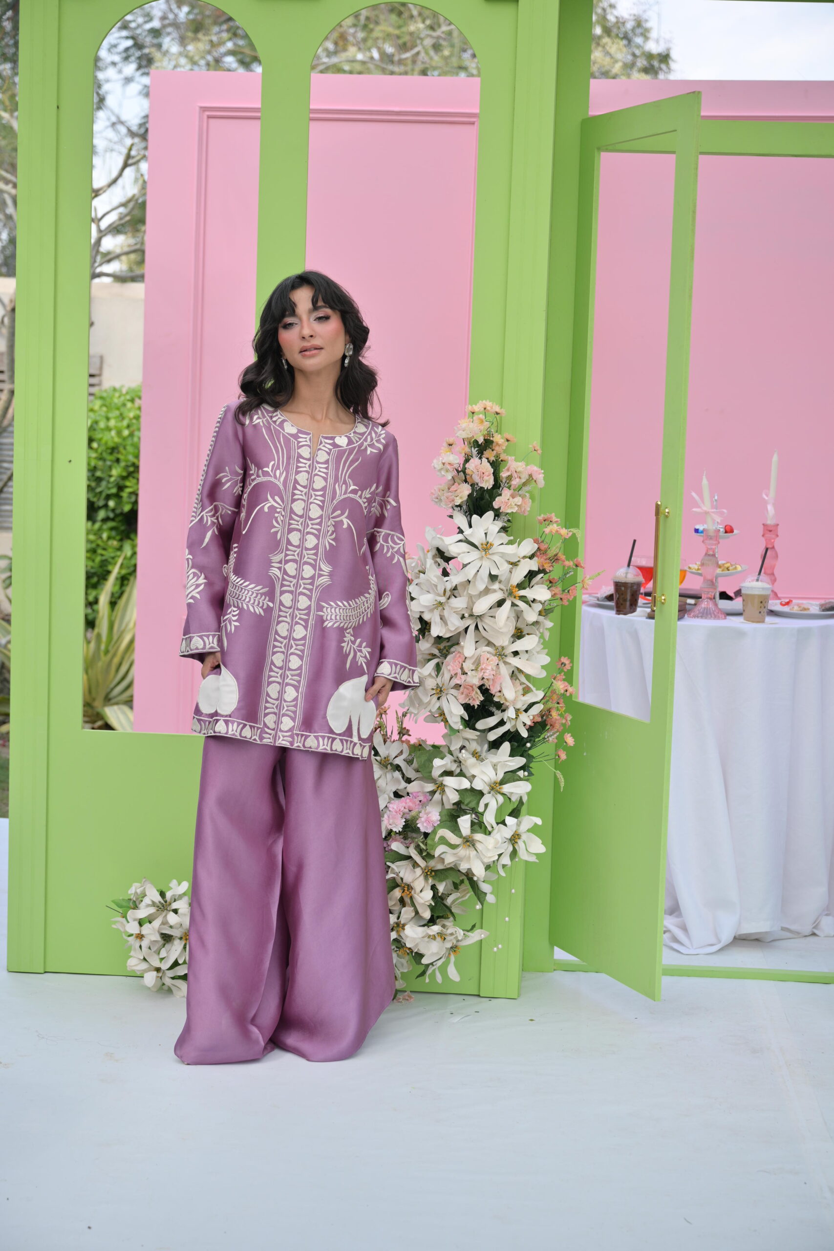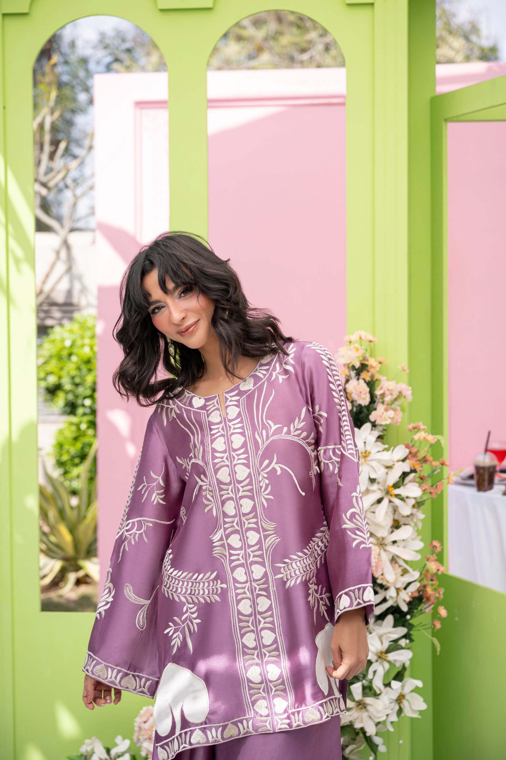Regal mauve hues meet refined machine work and organza leaves on this sheesha silk ensemble, styled to perfection. This Eid, style a short shirt with loose pants for effortless chic.