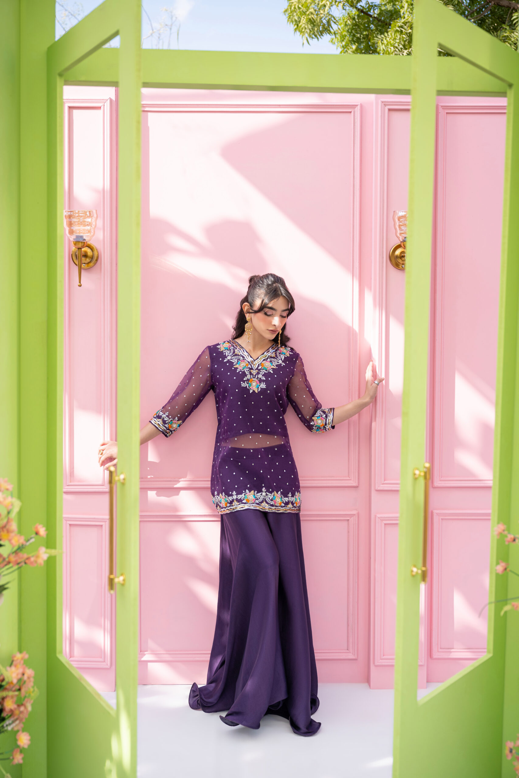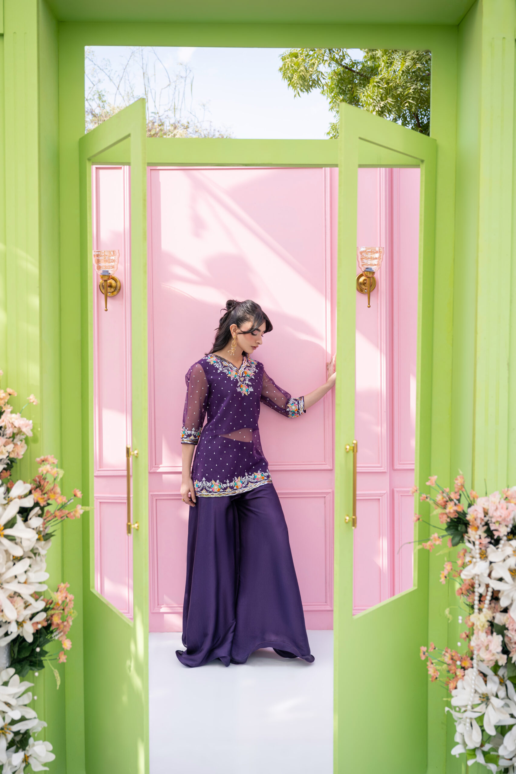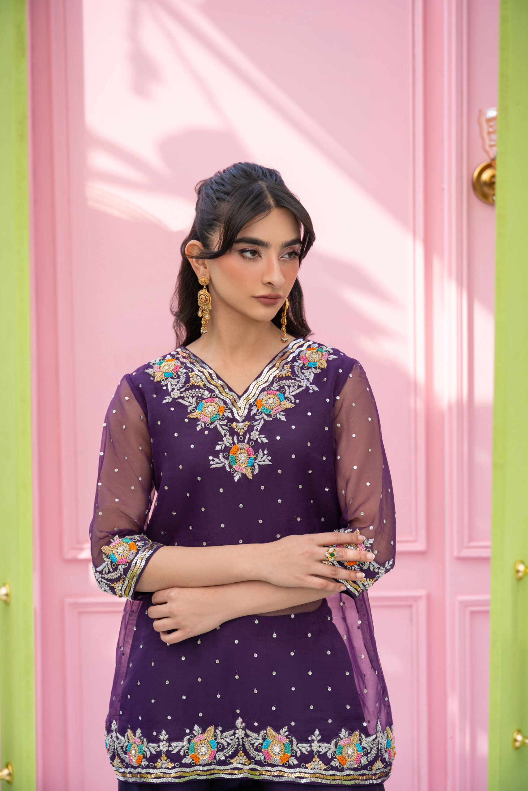 A statement in purple – This short net shirt is richly adorned with heavy adda work on the neckline, daman and sleeves. Embellished with vibrant kora, dabka, resham and chaan detailling all over. Paird beautifully with an embellished choli and loose pants – perfect for festive evenings and special celebration.