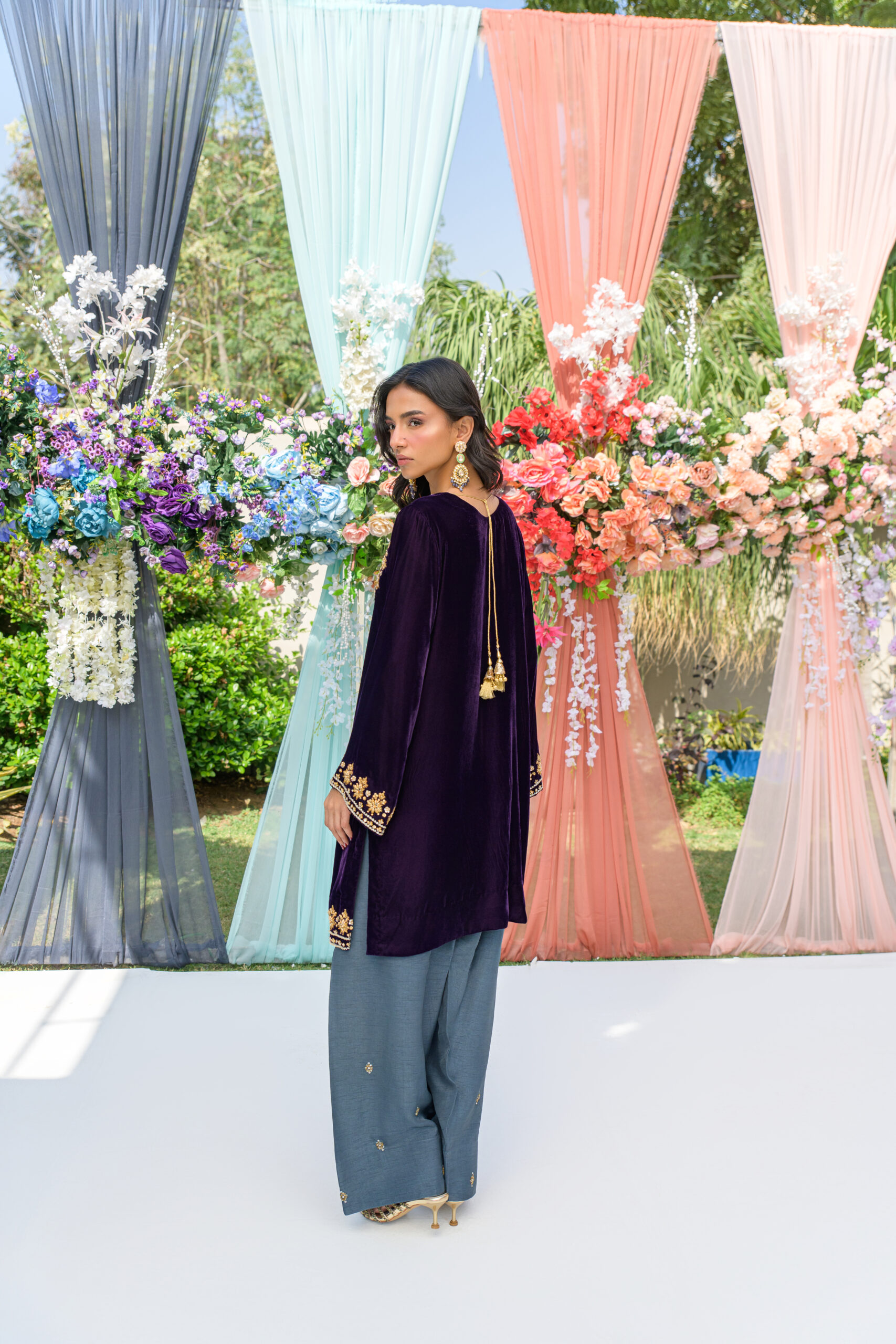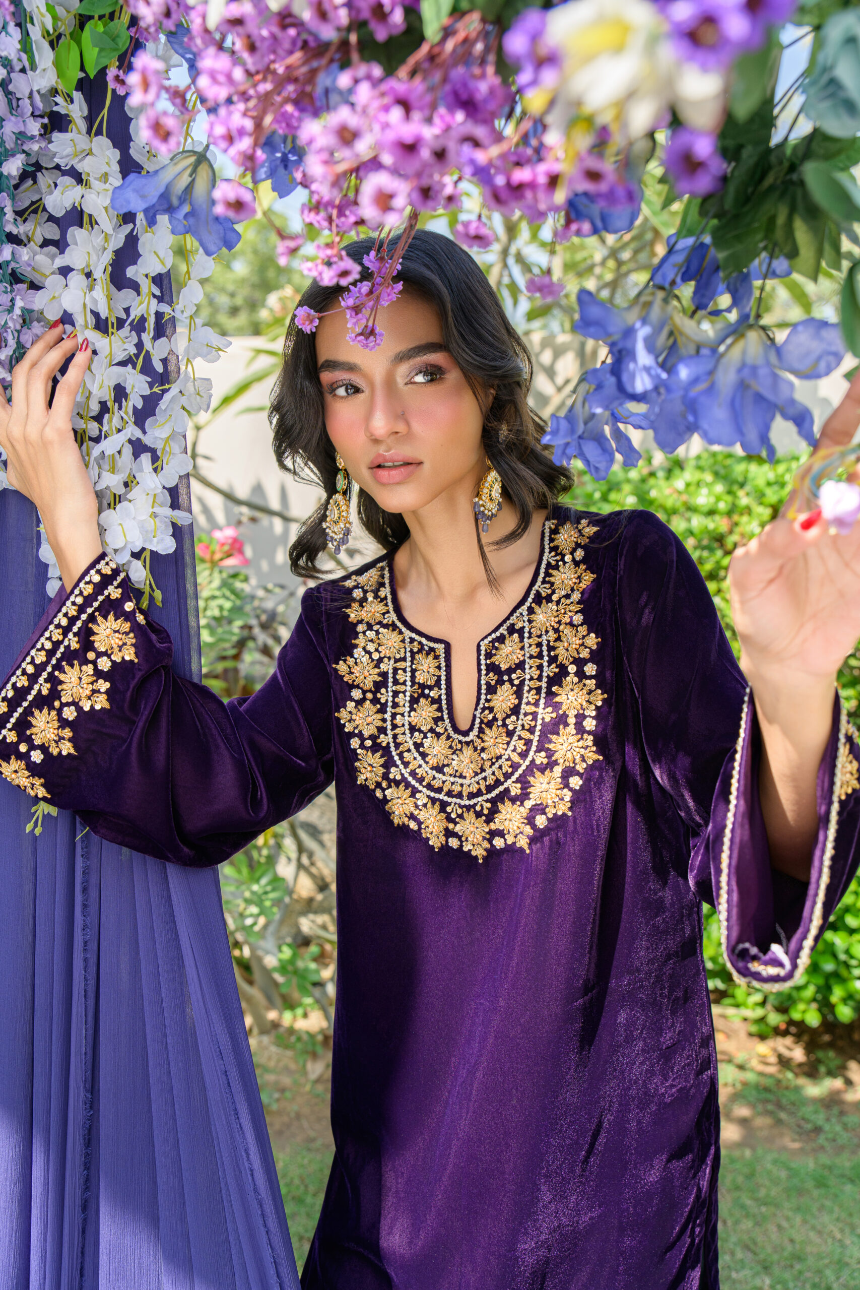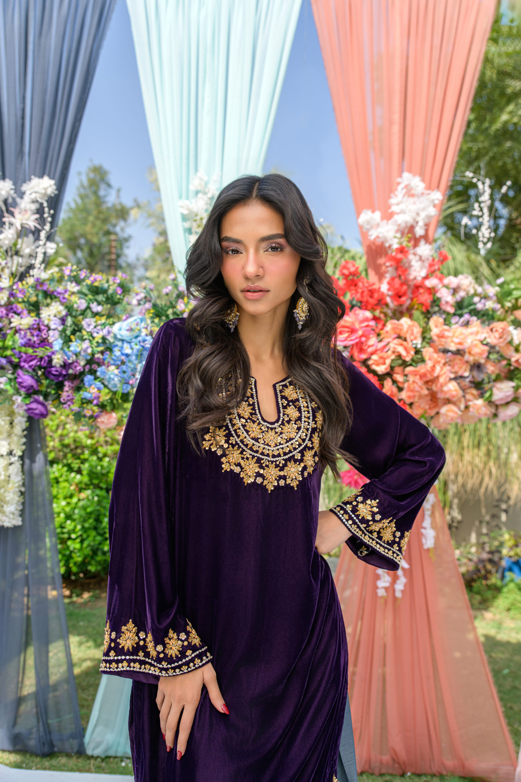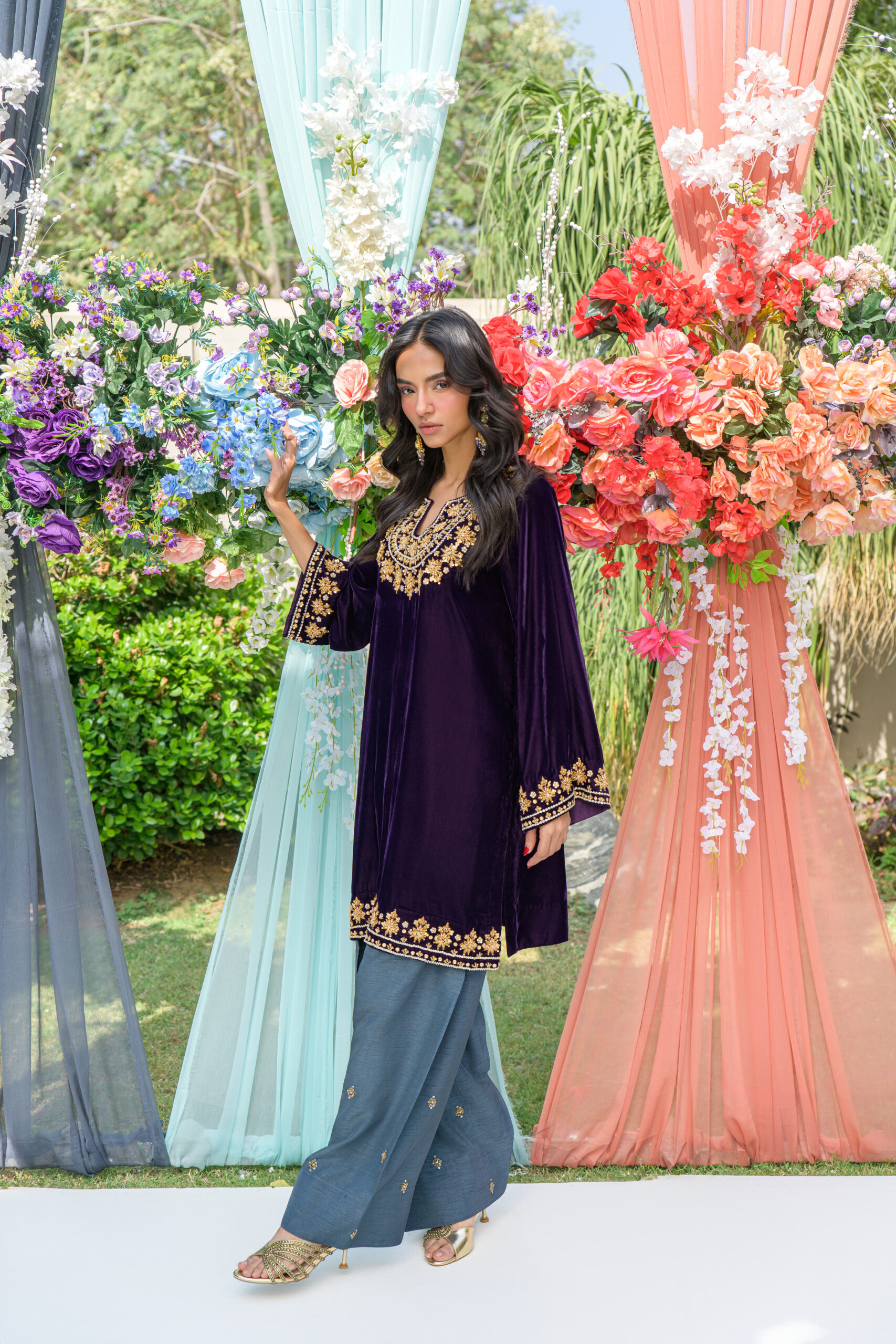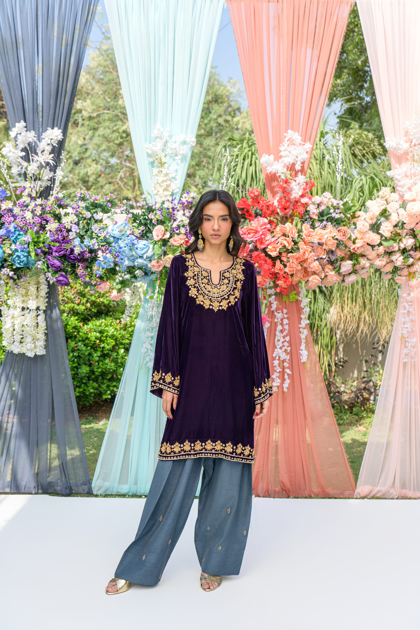 A luxurious purple velvet short shirt, adorned with delicate hand work on the neck, daman, and sleeves—crafted for elegance in every detail. Paired with a modern grey shalwar, also featuring