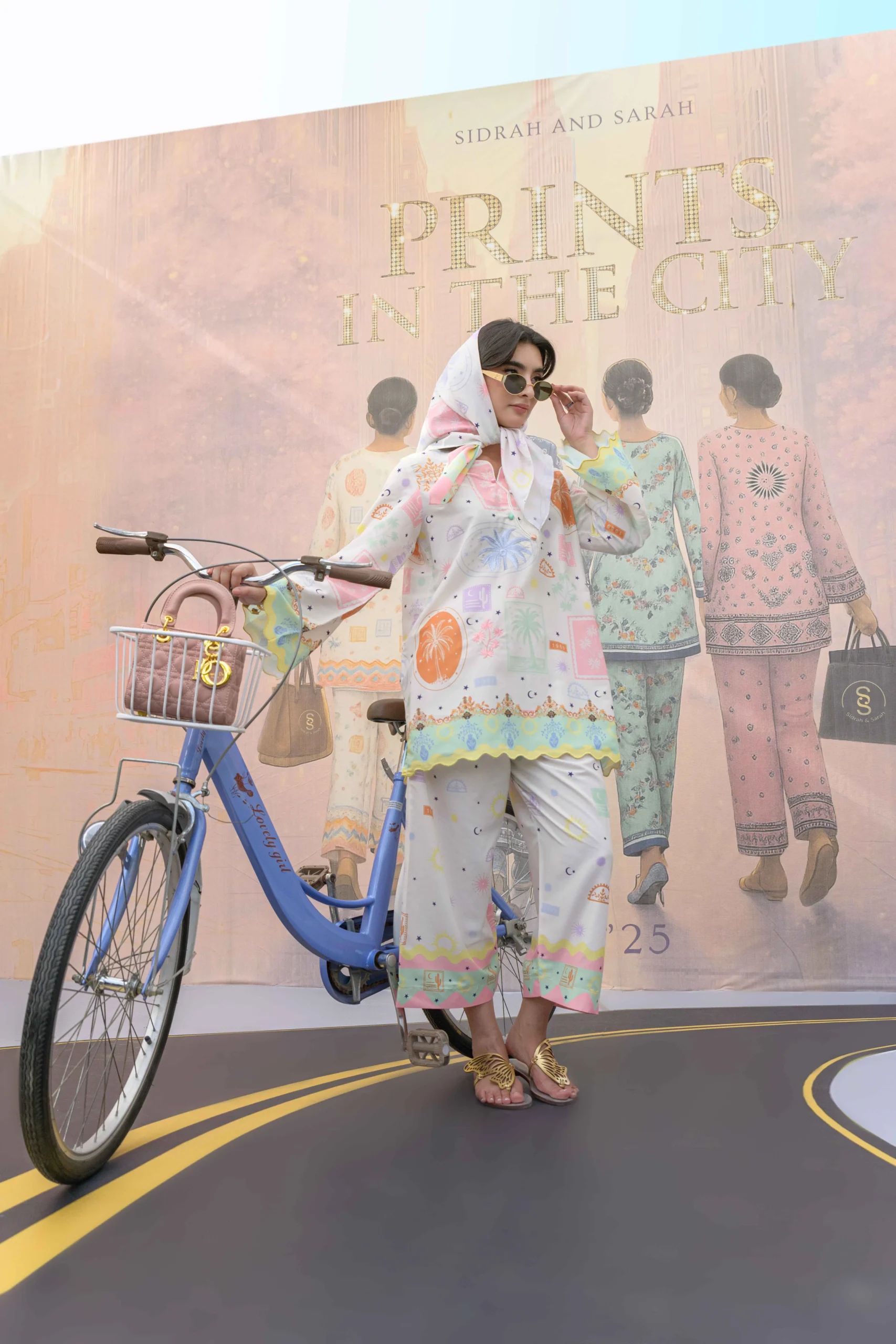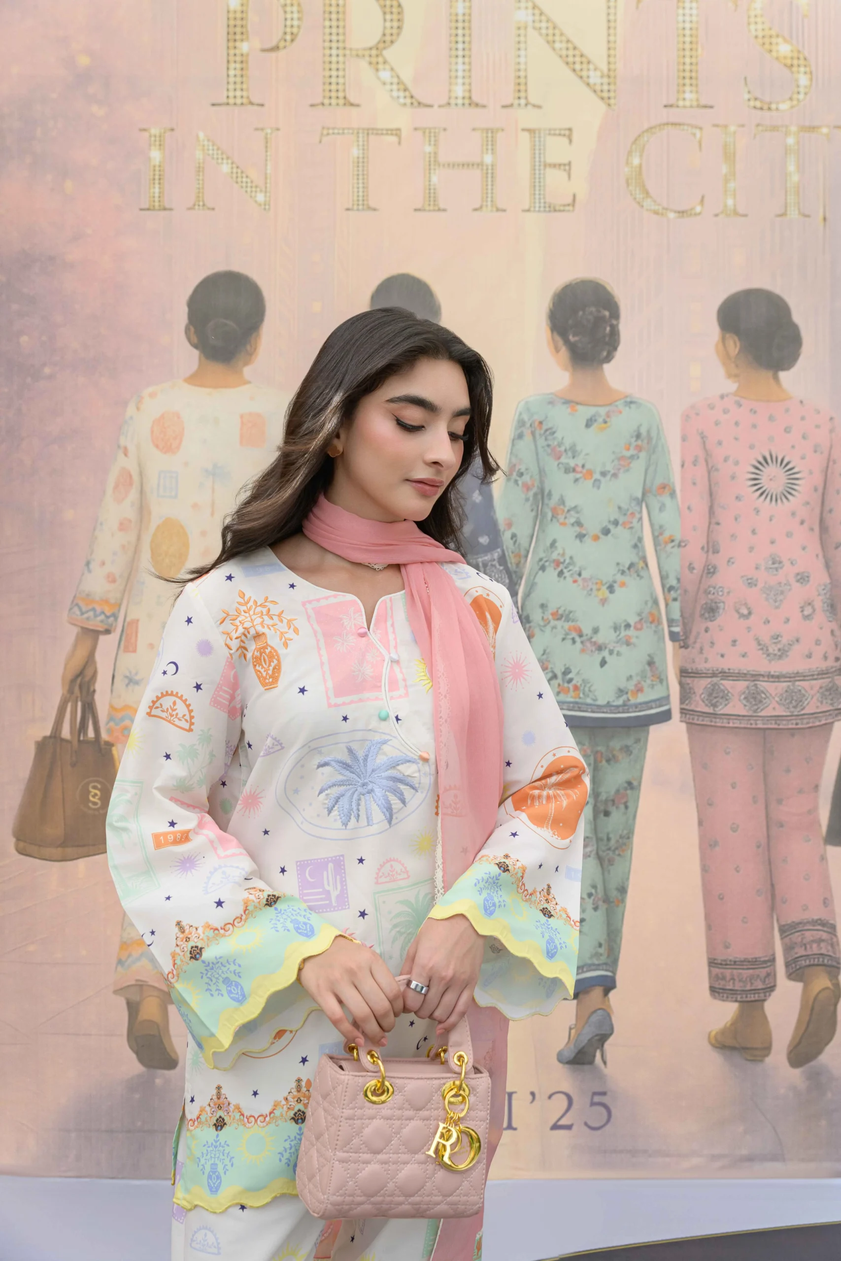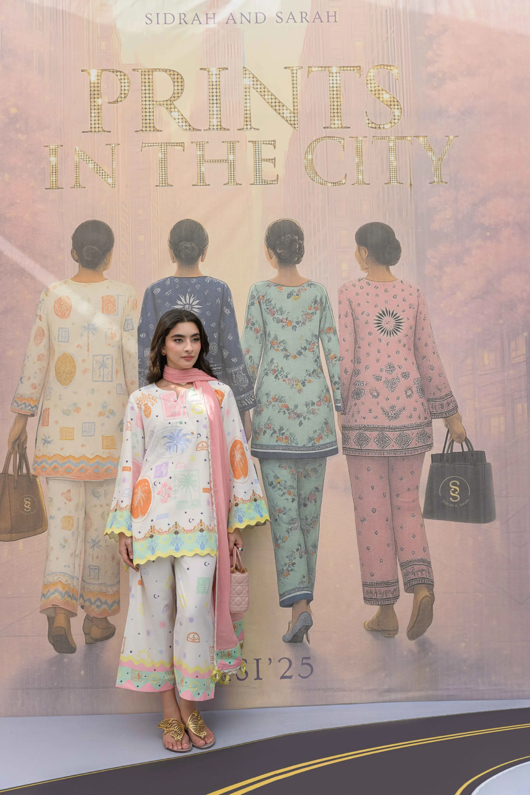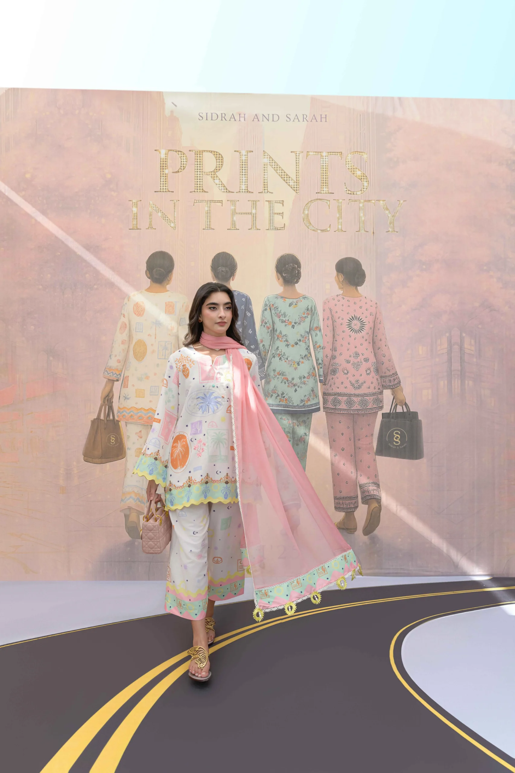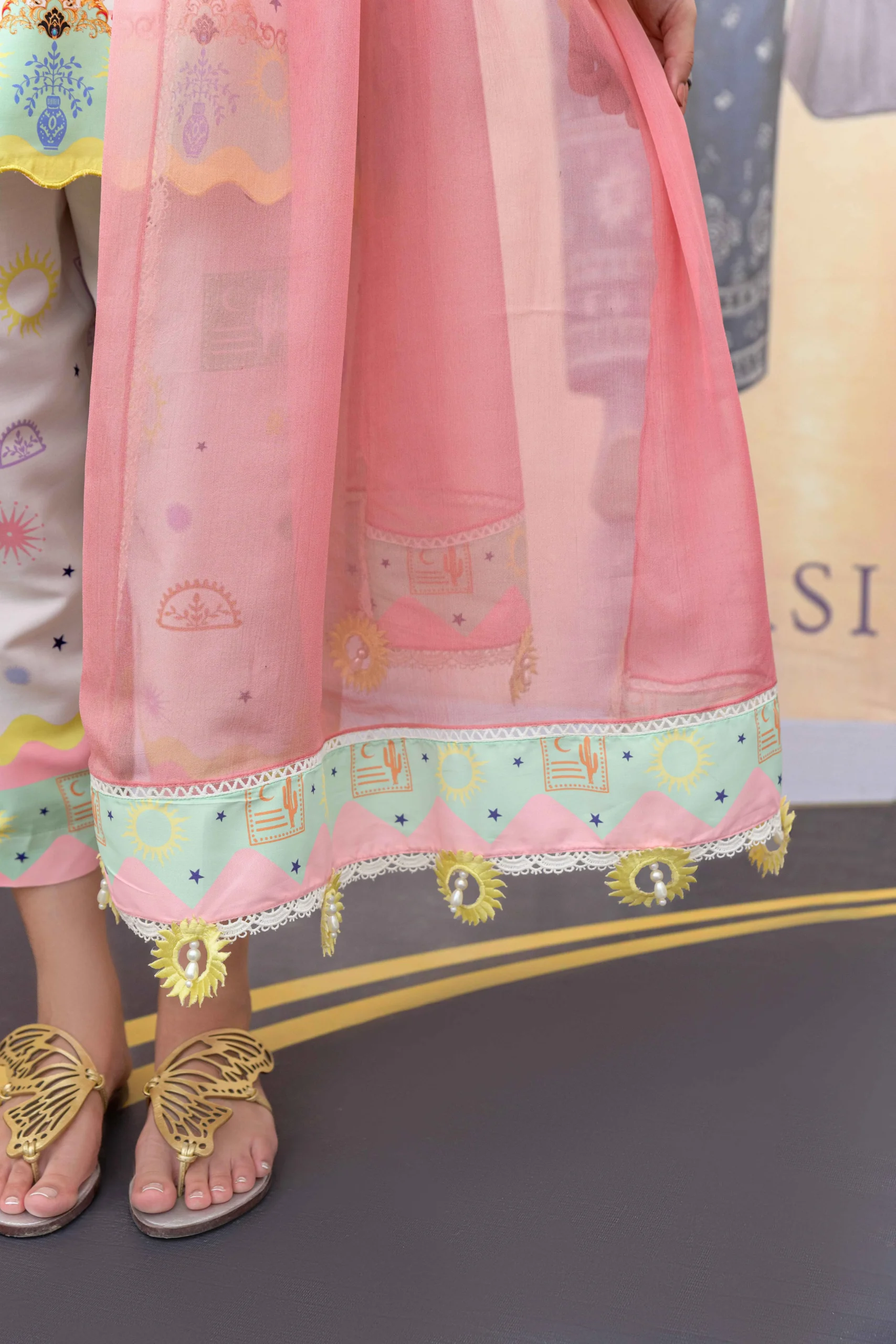 A fresh white canvas brought to life with colorful palm trees, playful city-inspired motifs, and intricate embroidery. The shirt features scalloped detailing on the sleeves and hem, paired with matching trousers adorned with scalloped details. Style it with the blush pink dupatta, sold separately, finished with pastel lacework and 3D floral & tassels a dreamy final touch for this statement ensemble.
