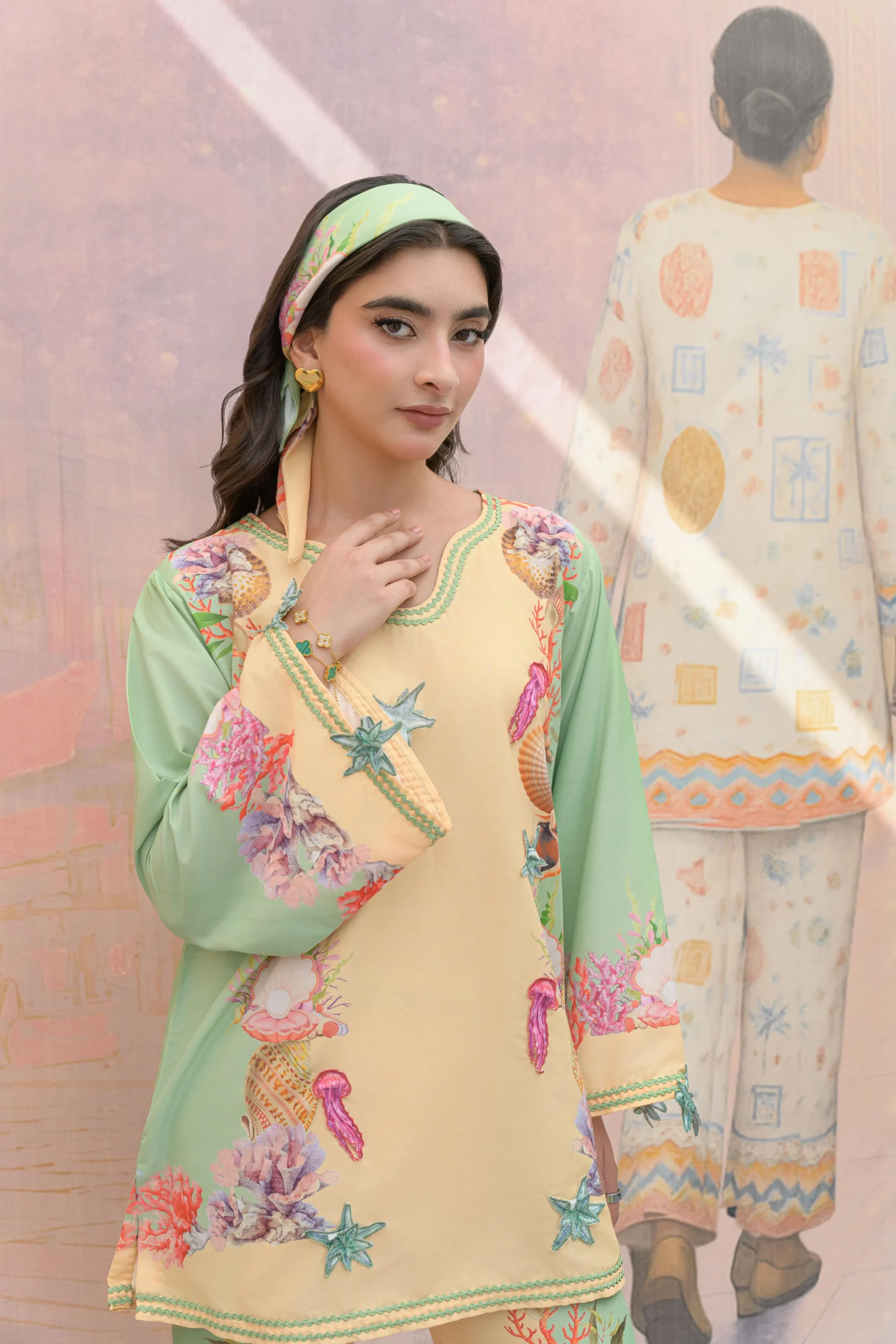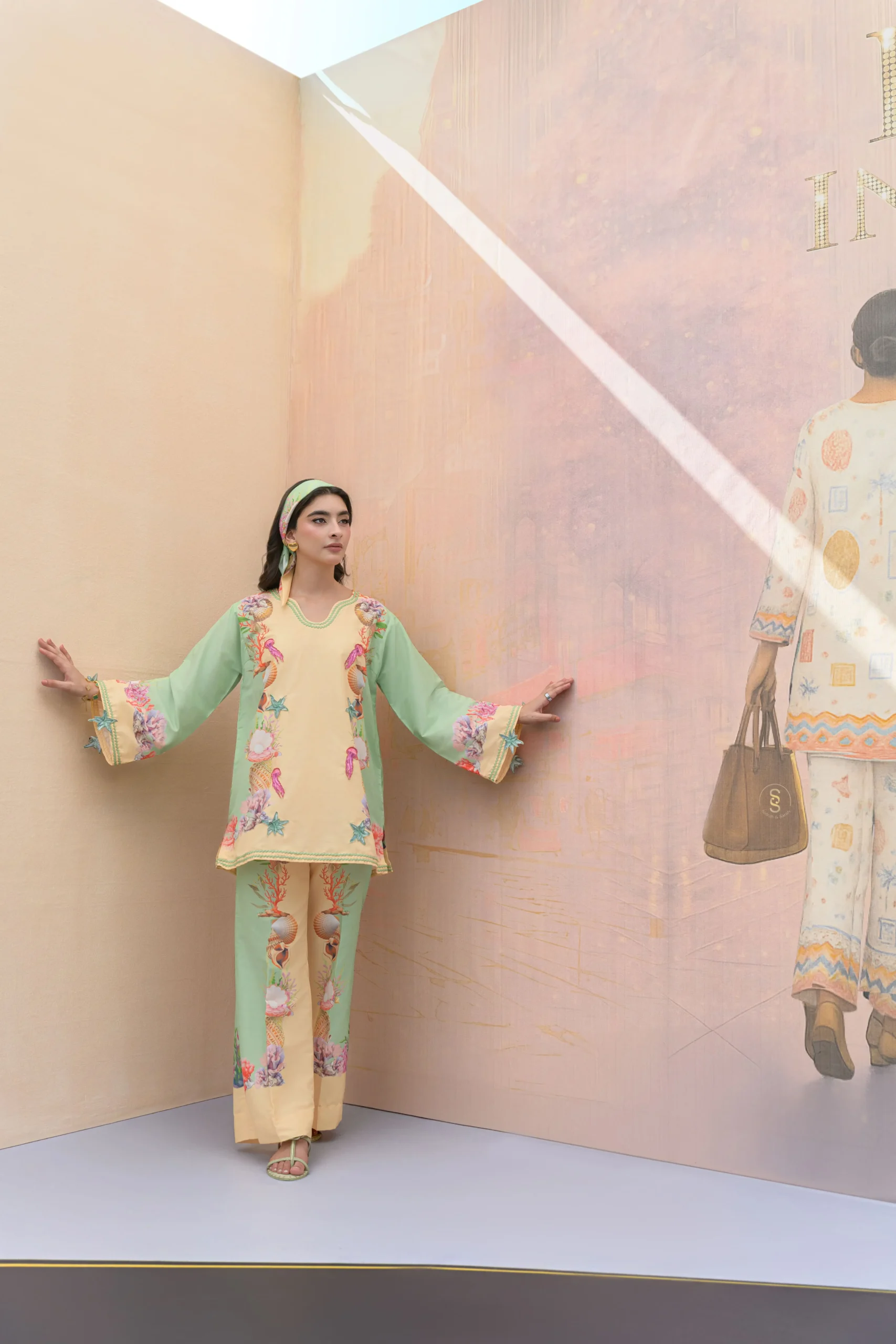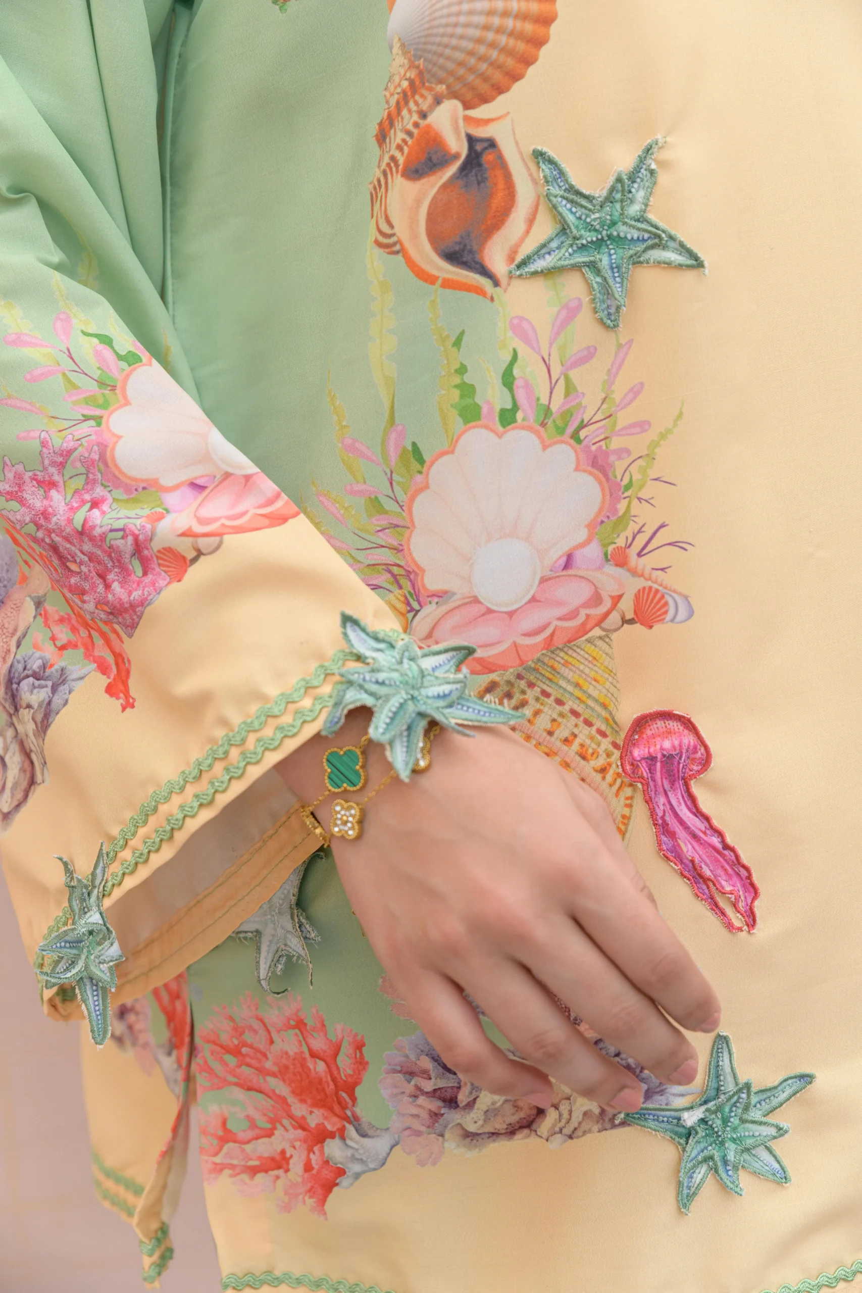 Make waves with this ocean-inspired two-piece set in refreshing shades of green and yellow. Featuring intricate 3D appliqué details of octopus and starfish, this playful yet elegant ensemble is crafted for the bold and the imaginative. The set combines effortless wearability with statement design perfect for city strolls, beach getaways, or wherever your daydreams take you.