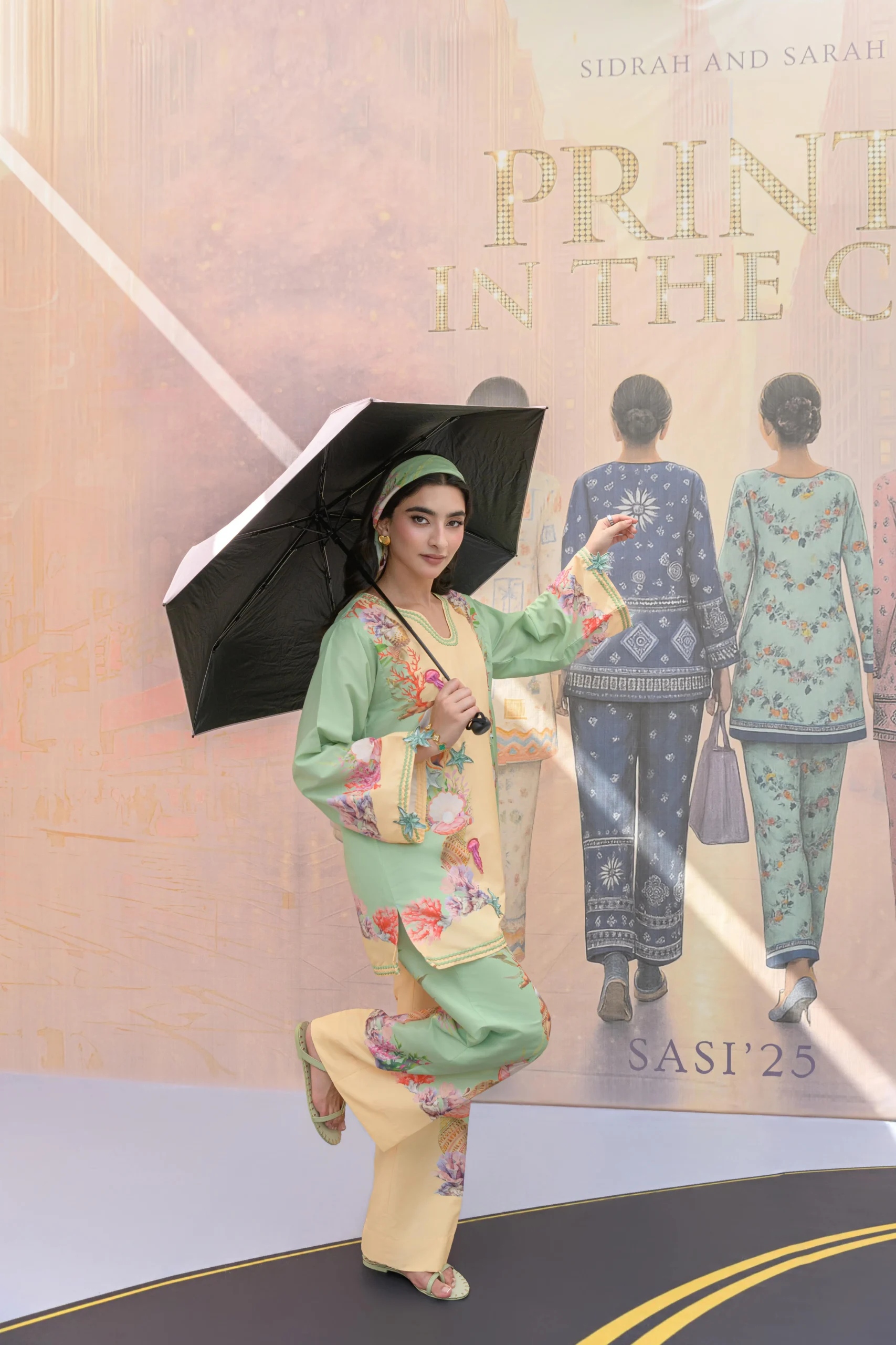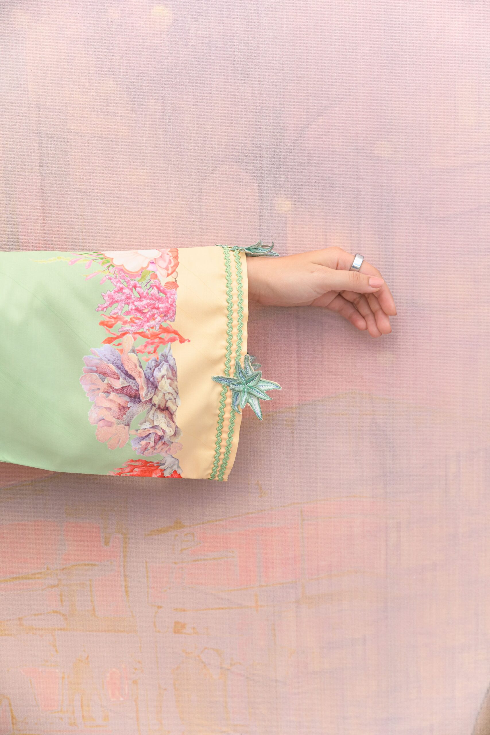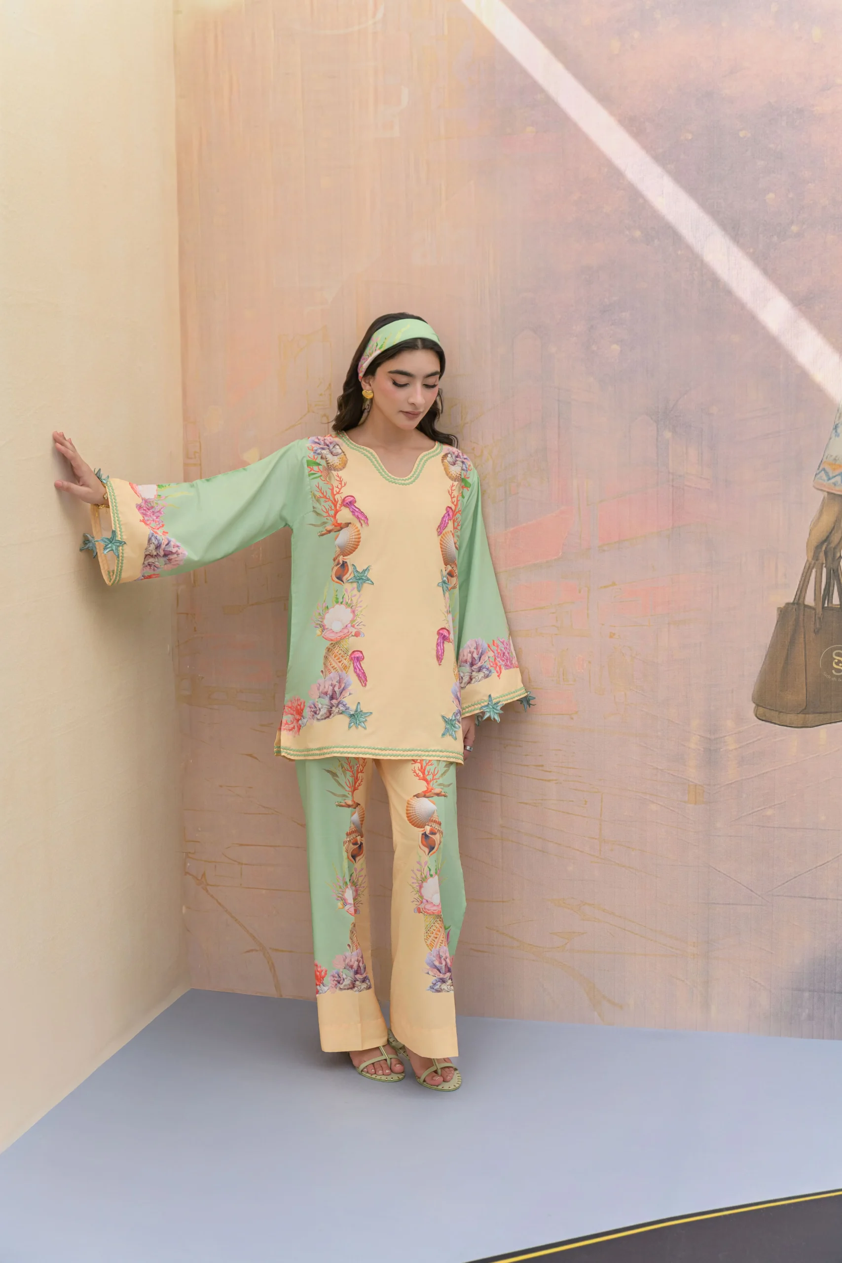 Make waves with this ocean-inspired two-piece set in refreshing shades of green and yellow. Featuring intricate 3D appliqué details of octopus and starfish, this playful yet elegant ensemble is crafted for the bold and the imaginative. The set combines effortless wearability with statement design perfect for city strolls, beach getaways, or wherever your daydreams take you.